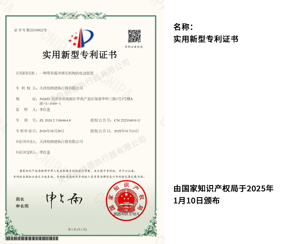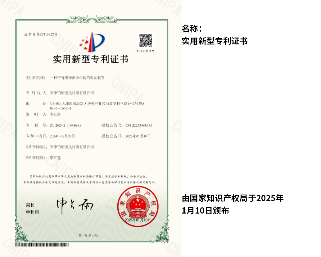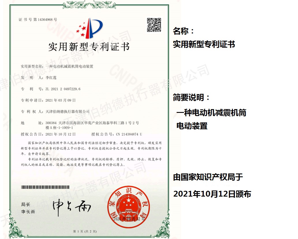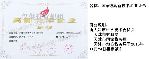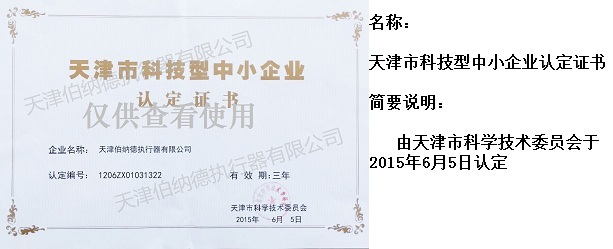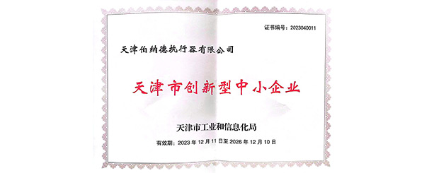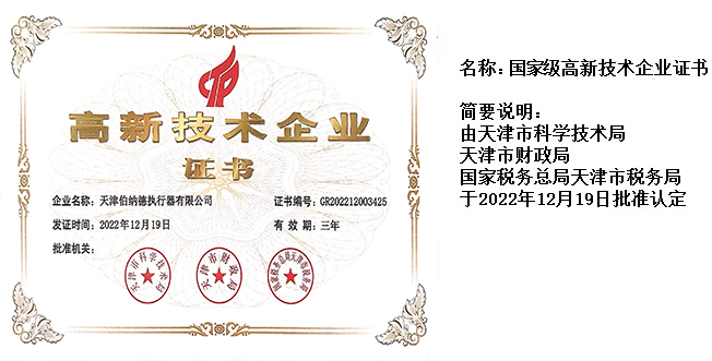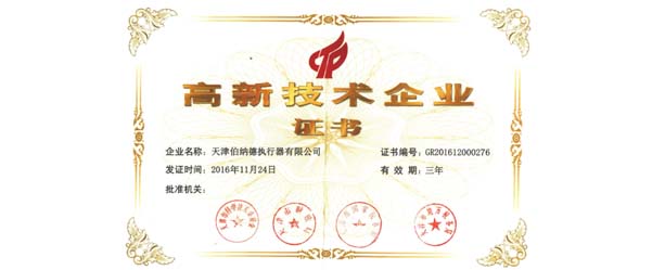 天津伯納德執行器有限公司(以下簡稱天津伯納德)位于高新產業園區—華苑產業園區,是受國家扶持的高新技術企業,連續9年獲得了“國家高新技術企業證書”,并且獲得了“天津市市級高新技術企業證書”和“國家科技型中小企業”、“天津市科技型中小企業認證證書”等榮譽稱號。