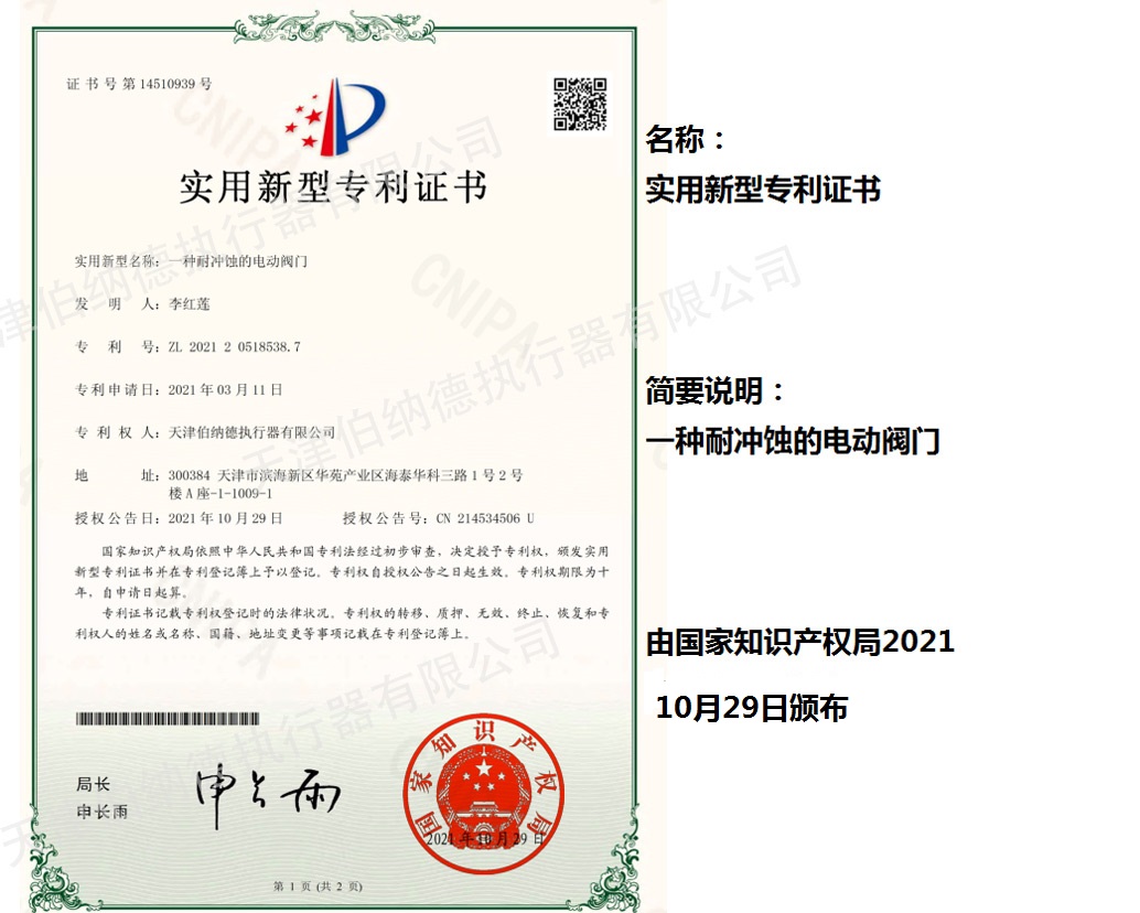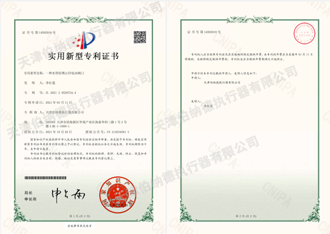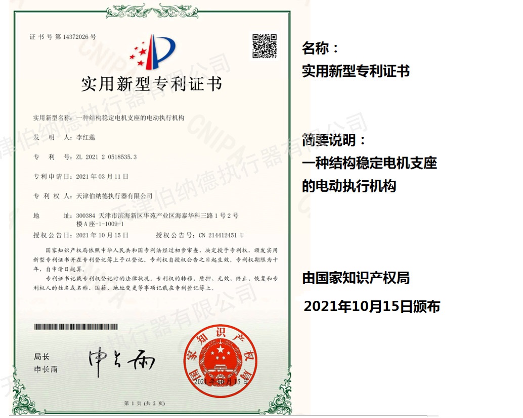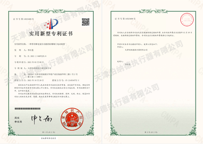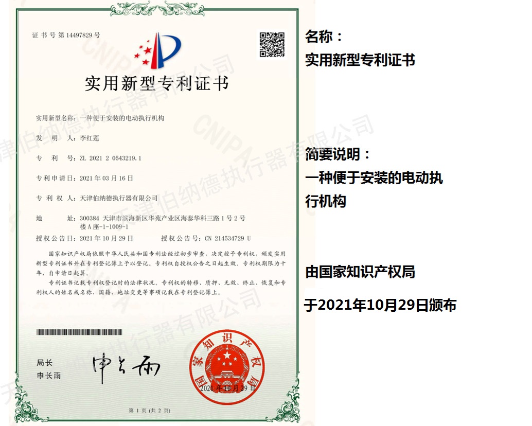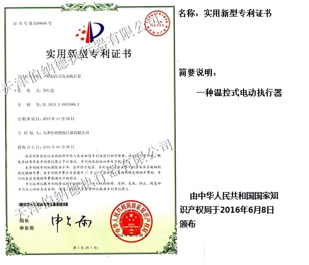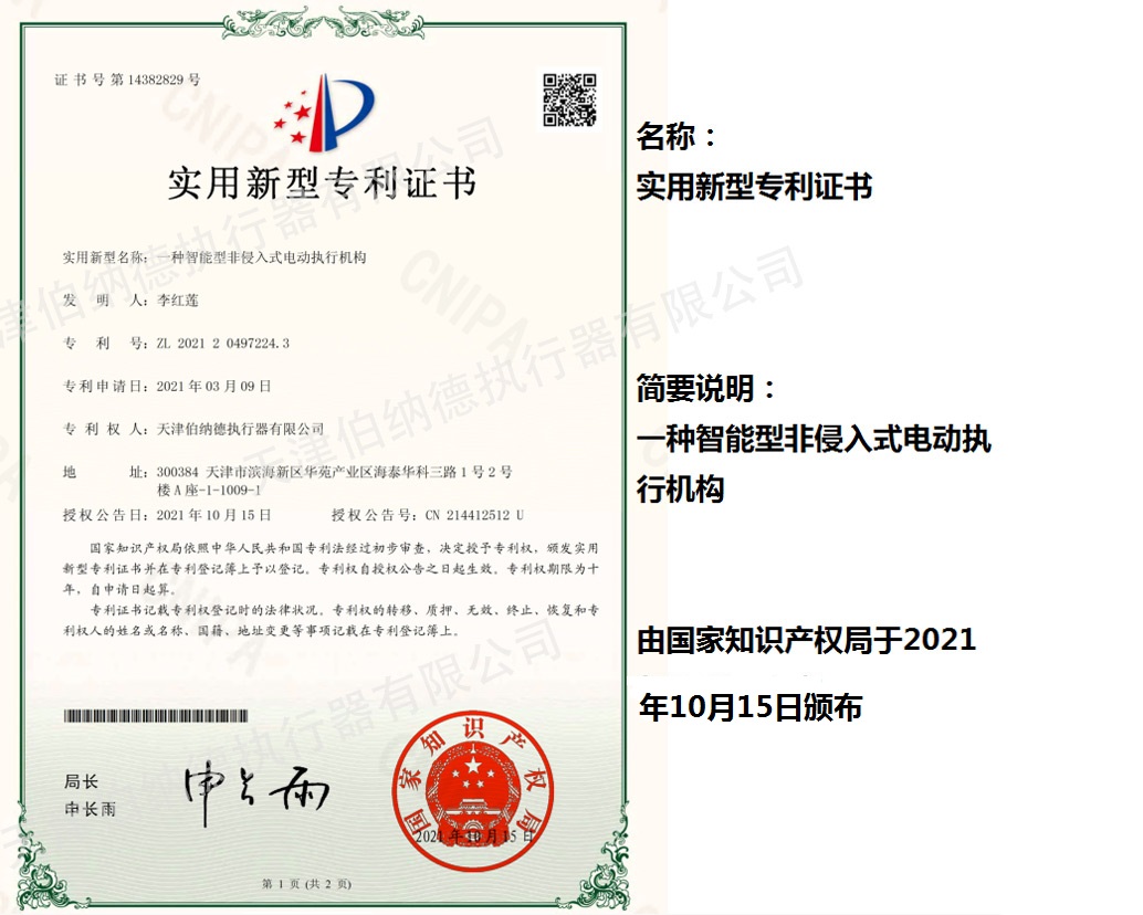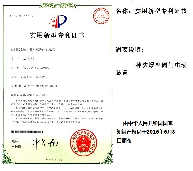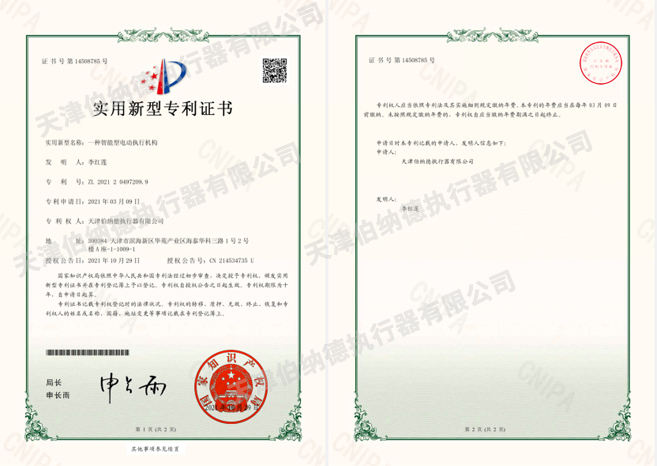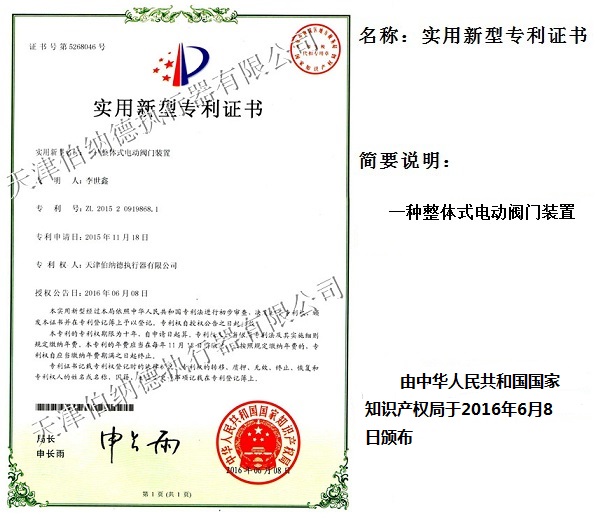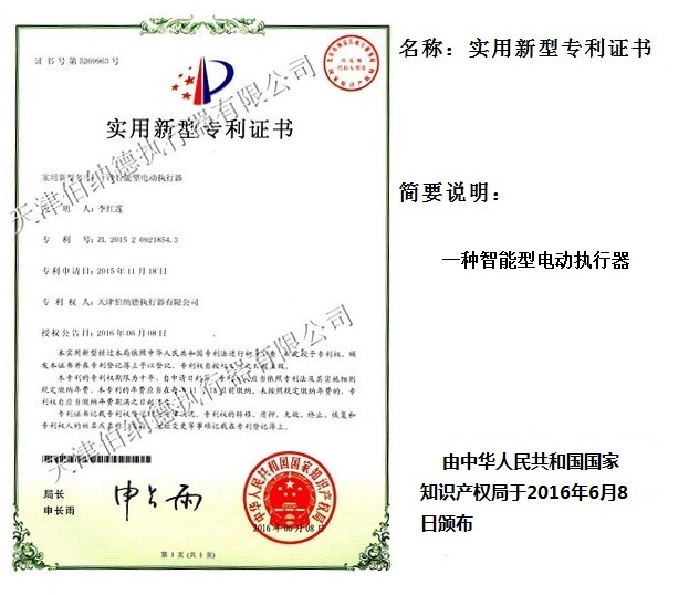 天津伯納德是生產電動執行機構的制造企業,擁有自身的專利和技術研發團隊,擁有過多項專利,榮獲“溫控式電動執行器實用新型專利證書”、“整體式電動閥門裝置實用新型專利證書”、“防爆型閥門電動裝置實用新型專利證書”、“智能型電動執行器實用新型專利證書”、“智能型電動調節閥實用新型專利證書”等專利證書。 天津伯納德生產的智能型電動執行機構,使用數字集成芯片,可選配全中文菜單操作和顯示、智能、人性化的機電一體的結構設計,免開蓋紅外線遙控器設定造就了其完善的功能、輕巧美觀、調試簡單、操作方便、中文菜單智能顯示簡單明了、可靠,充分保護,具有其完善的保護功能。