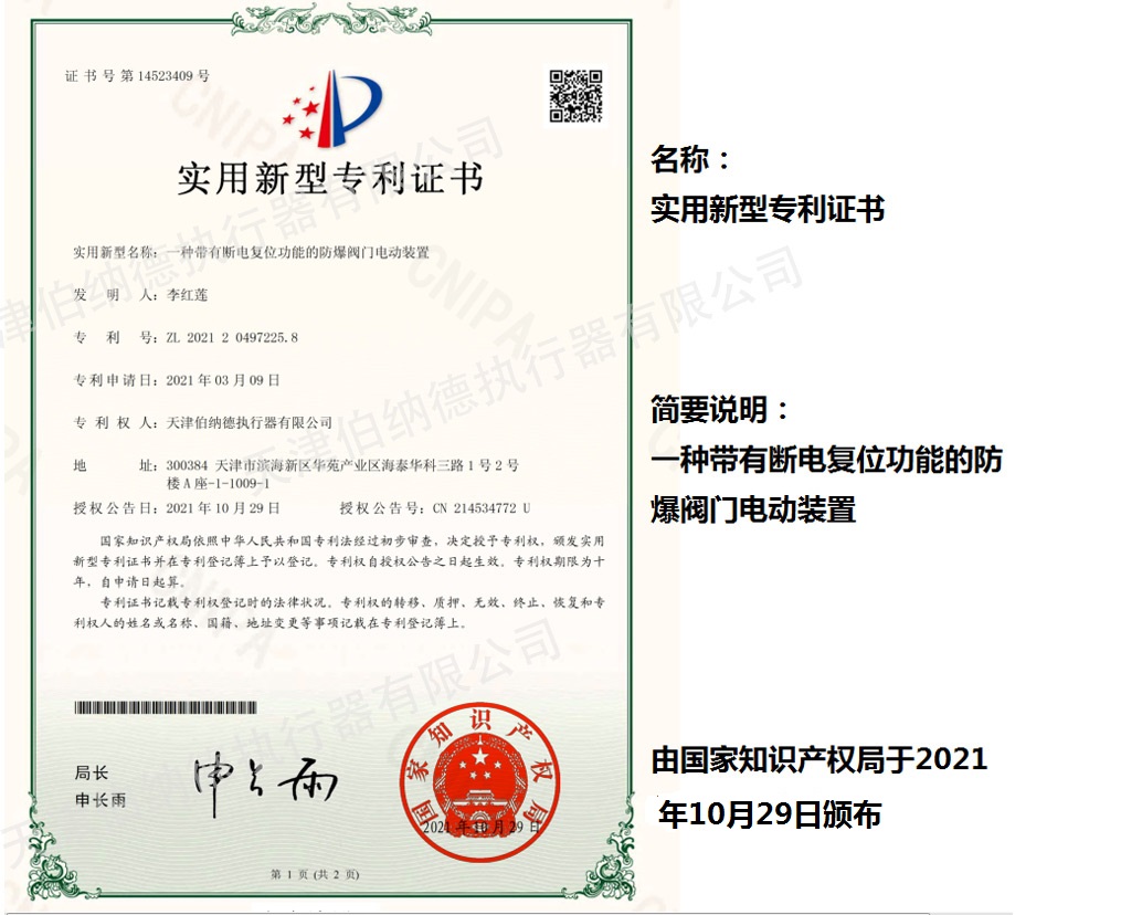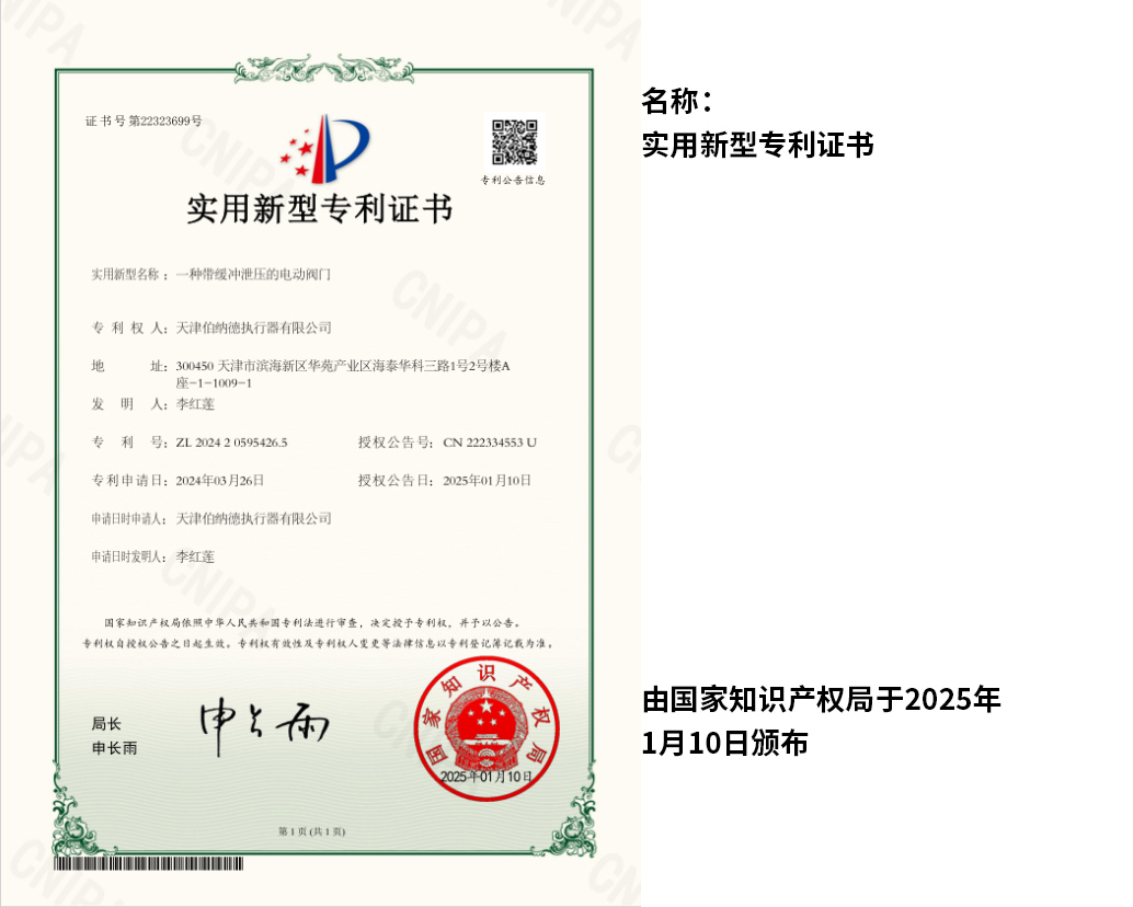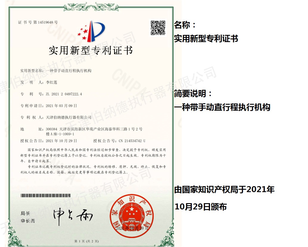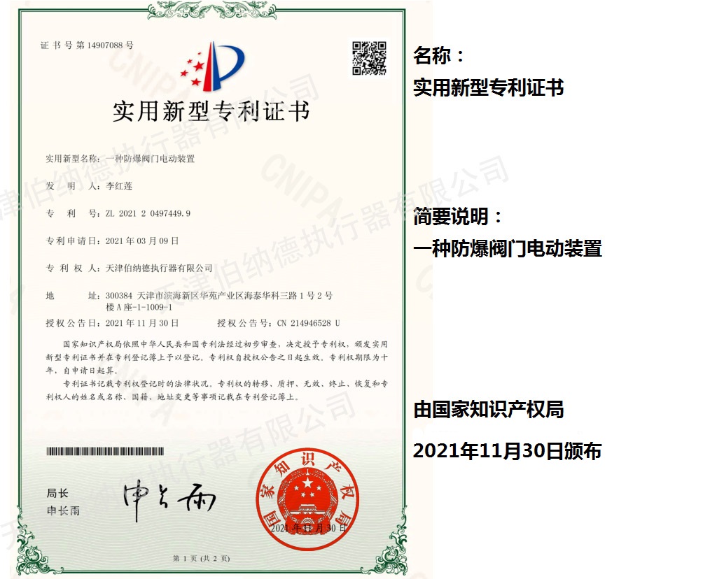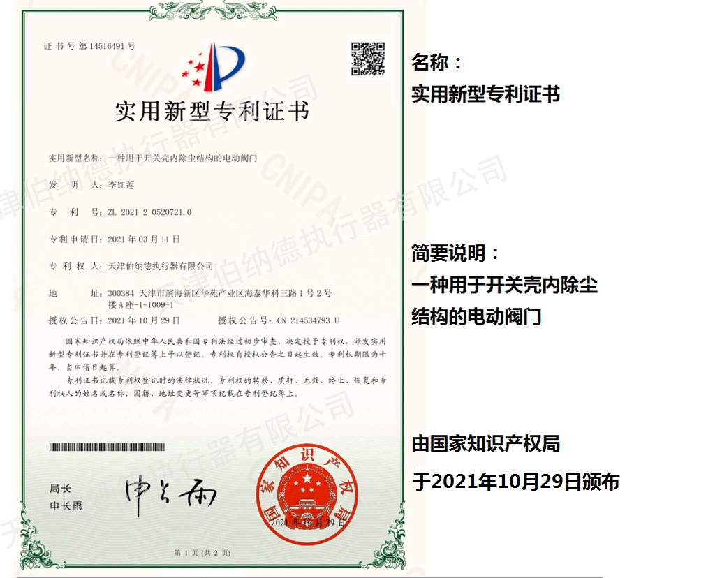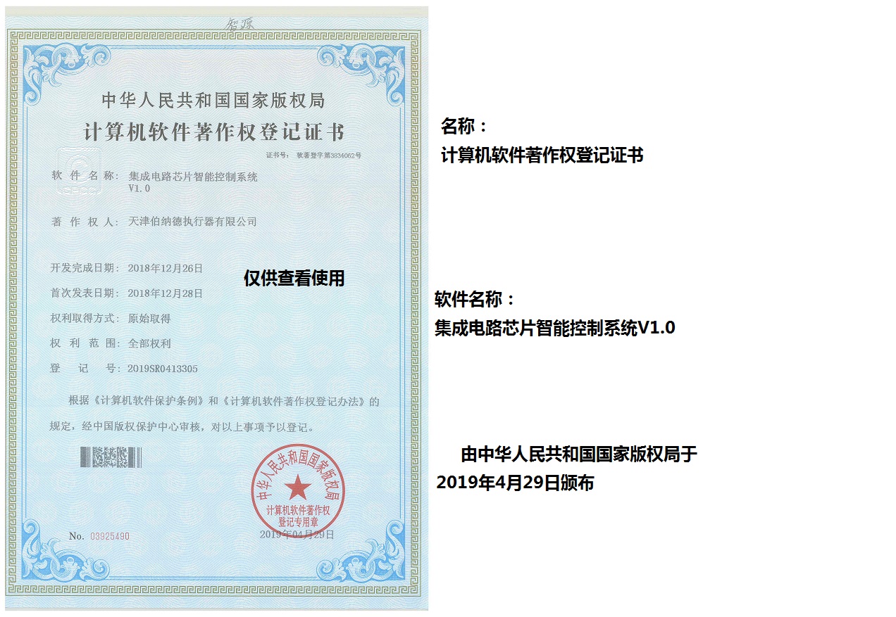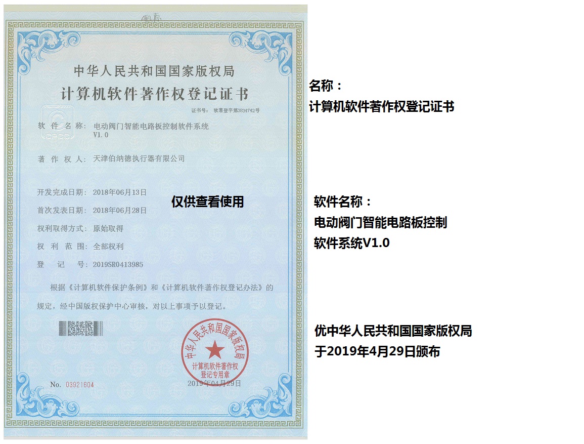 天津伯納德是生產電動執行機構的制造企業,擁有自身的專利和技術研發團隊,擁有過多項專利,榮獲“溫控式電動執行器實用新型專利證書”、“整體式電動閥門裝置實用新型專利證書”、“防爆型閥門電動裝置實用新型專利證書”、“智能型電動執行器實用新型專利證書”、“智能型電動調節閥實用新型專利證書”等專利證書。 天津伯納德生產的智能型電動執行機構,使用數字集成芯片,可選配全中文菜單操作和顯示、智能、人性化的機電一體的結構設計,免開蓋紅外線遙控器設定造就了其完善的功能、輕巧美觀、調試簡單、操作方便、中文菜單智能顯示簡單明了、可靠,充分保護,具有其完善的保護功能。