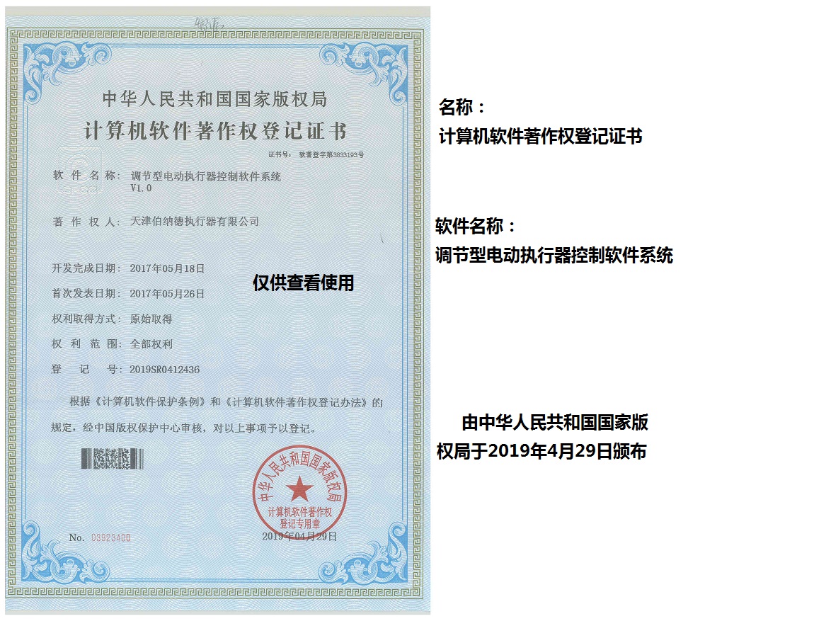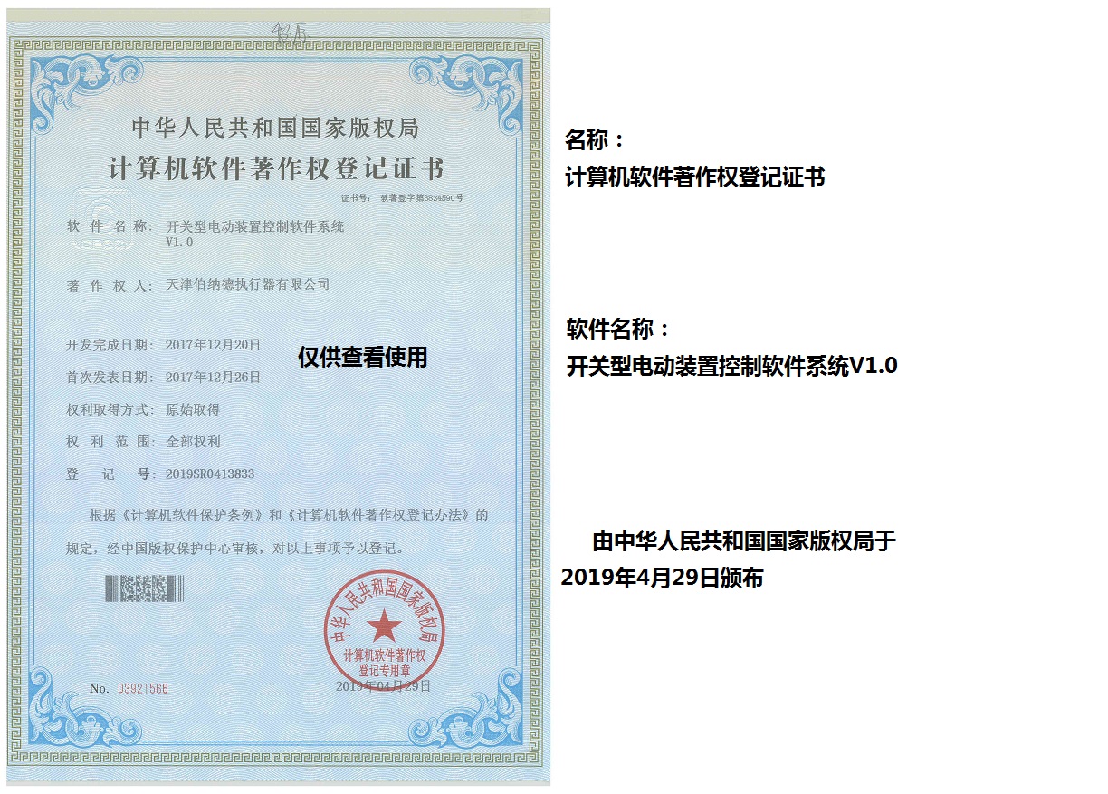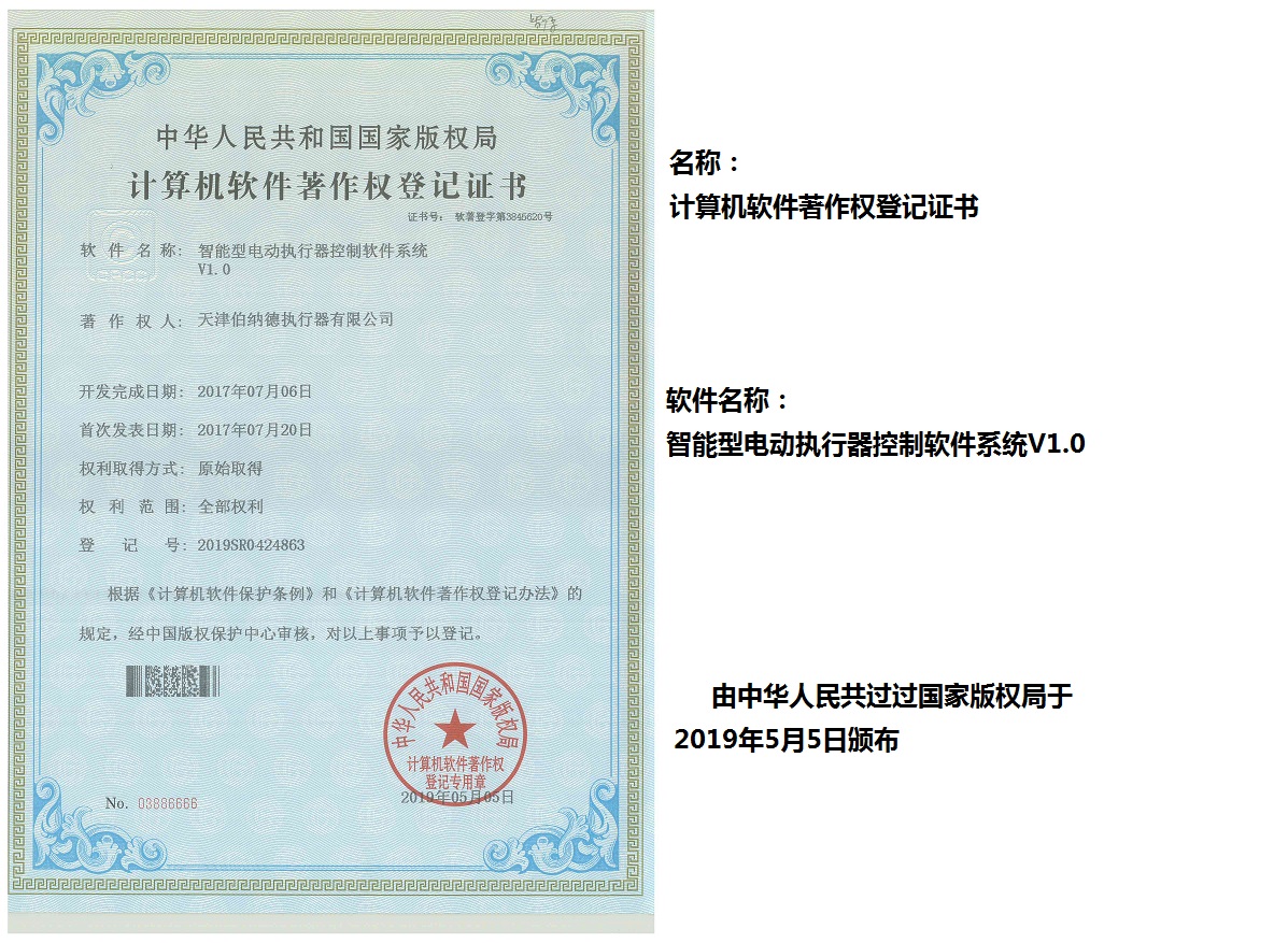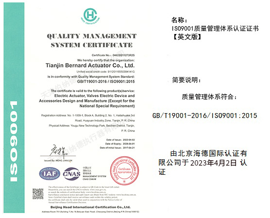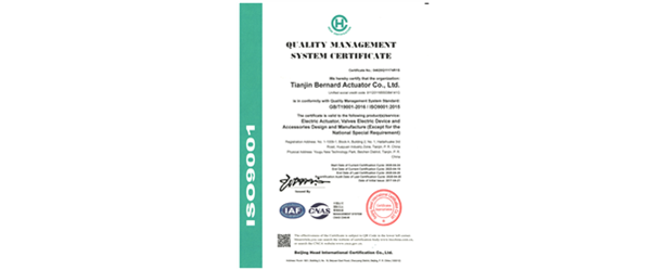 天津伯納德擁有技術人才和管理人才,是集智能型電動執行機構的研究開發、生產制造、銷售、安裝調試于一體的公司。天津伯納德堅持質量管理,不斷完善質量管理體系確保產品質量,提供售前售后服務,榮獲“ISO9001:2015質量管理體系認證證書”,歐盟市場認證產品的“C E認證證書”,及俄羅斯認證產品的“E A C認證證書”。
